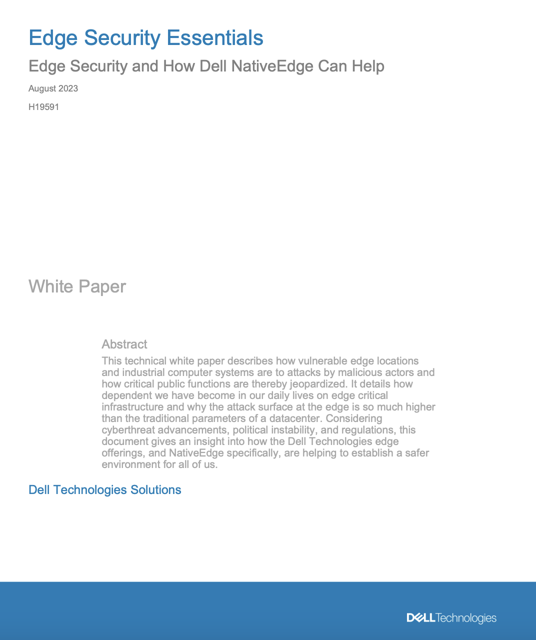 This technical white paper describes how vulnerable edge locations and industrial computer systems are to attacks by malicious actors and how critical public functions are thereby jeopardized. It details how dependent we have become in our daily lives on edge critical infrastructure and why the attack surface at the edge is so much higher than the traditional parameters of a datacenter. Considering cyberthreat advancements, political instability, and regulations, this document gives an insight into how the Dell Technologies edge offerings, and NativeEdge specifically, are helping to establish a safer environment for all of us.